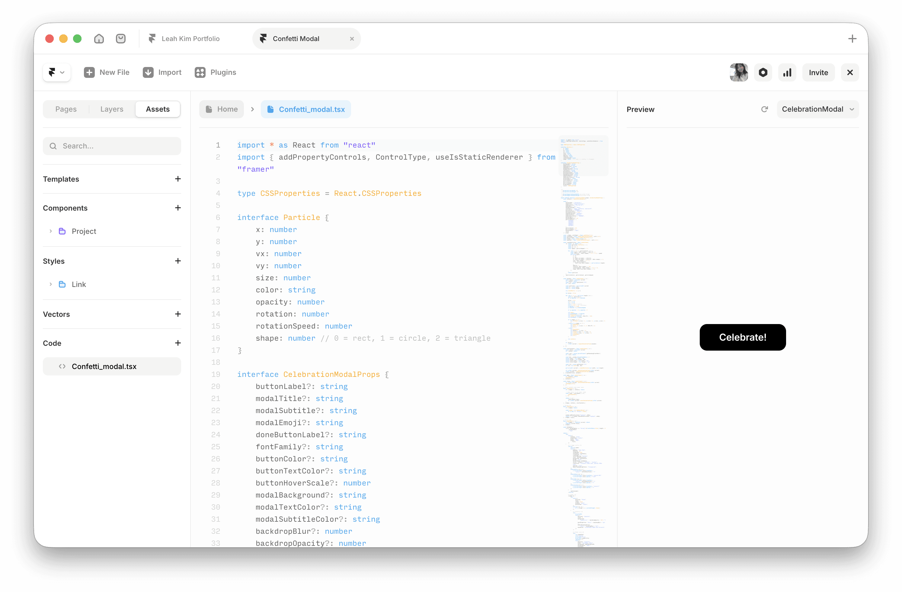 The component had to adapt to any brand. Every visual element — colors, copy, emoji, particle count, backdrop blur — is exposed as a Framer property control.