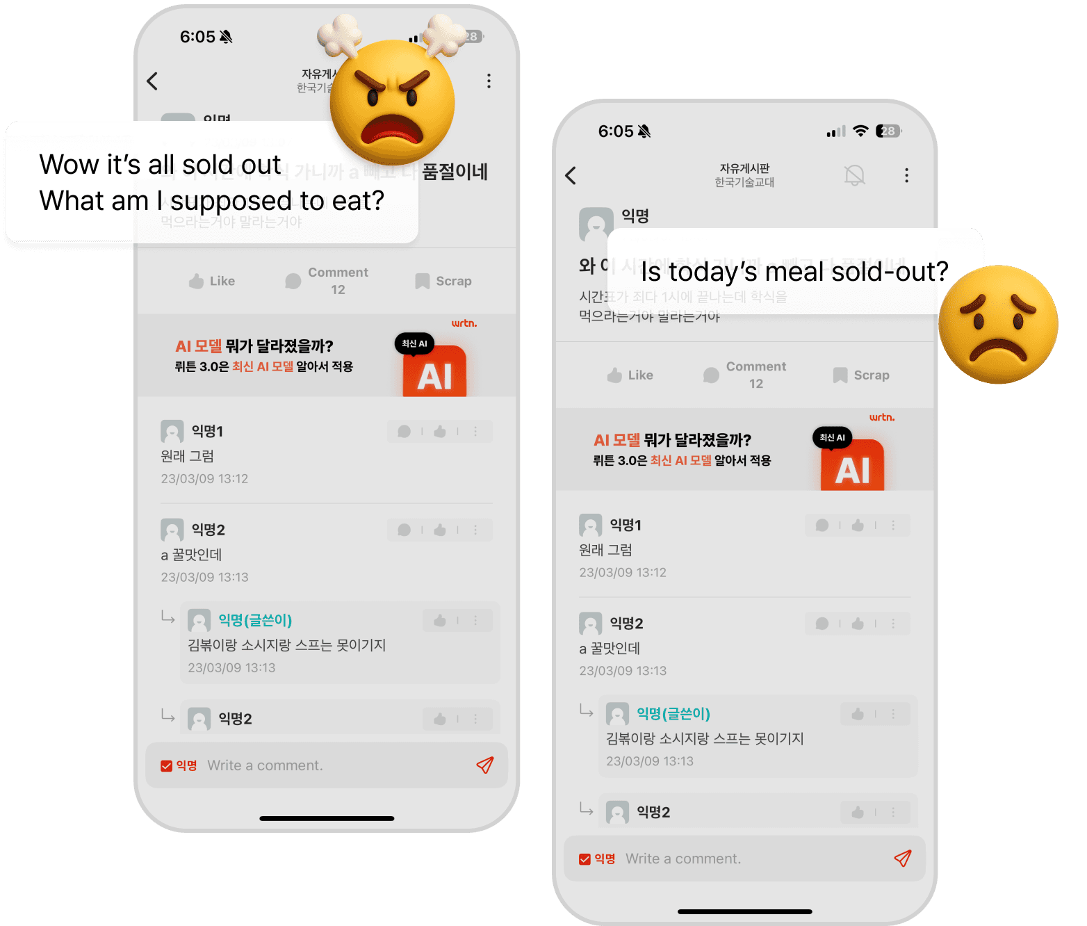 Students were rushing to the cafeteria only to find everything sold out. Because the app showed menus as text-only lists with no availability status, there was no way to know what was left before making the trip. Frustration spilled into campus community boards, with posts like "Wow it's all sold out, what am I supposed to eat?" appearing regularly.